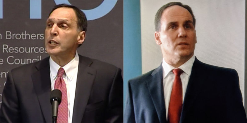 この映画、ファッションはかなり再現度が低いです。イギリスBBC制作だからなのかは知りませんが、ワイドスプレッドのシャツに英国調のスーツをみんな着ています。み―んなカフリンクスをしているし、ちょっと気取りすぎですね。実際のファルド(62当時)はボタンダウンシャツにネクタイという姿ばかりですし、FRB のポールソンも現実ではもっと普通の格好をしています。